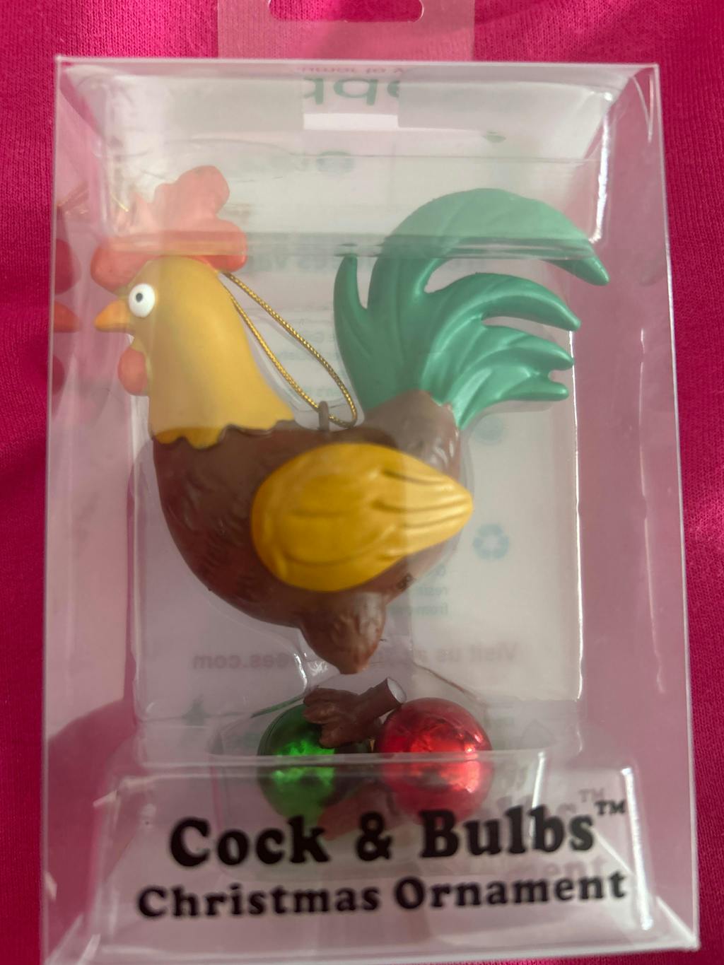 Deck the halls with laughs and dirty humor with our Cock and Bulbs goofy Christmas ornament! This cheeky decoration features a charming rooster ("cock") nestled among atop of colorful red and green Christmas bulbs. Perfect for adding a touch of humor to your holiday décor, this ornament is sure to spark conversations and laughter.