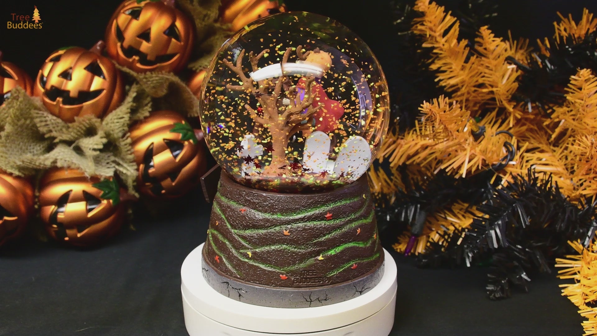 globe makes for a great indoor Halloween decoration. It displays the Headless Horseman in a graveyard. When you shake it, fall colored leaves float around the eerie scene.