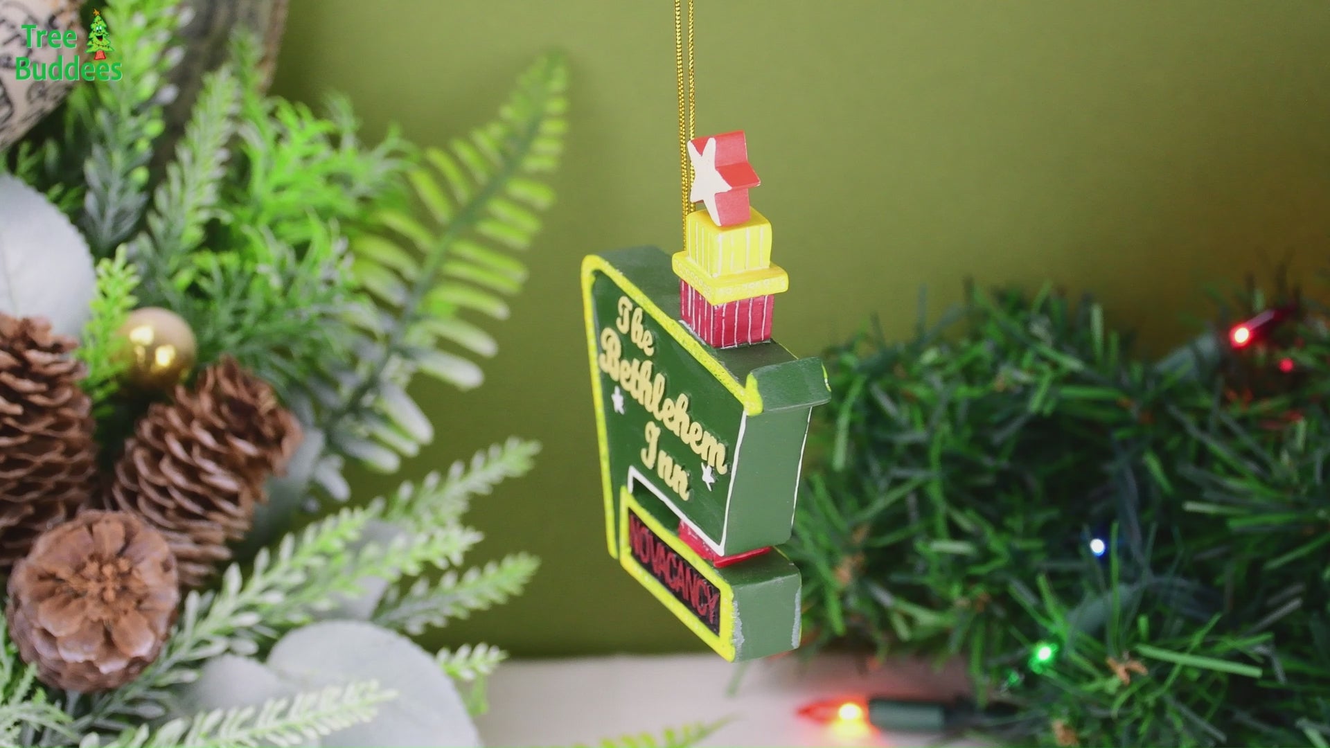 This fun and playful sign ornament is of the Bethlehem Inn which doesn’t seem to have any rooms left for Joseph and Mary. Baby Jesus was famously born in the manger due to this inconvenience.